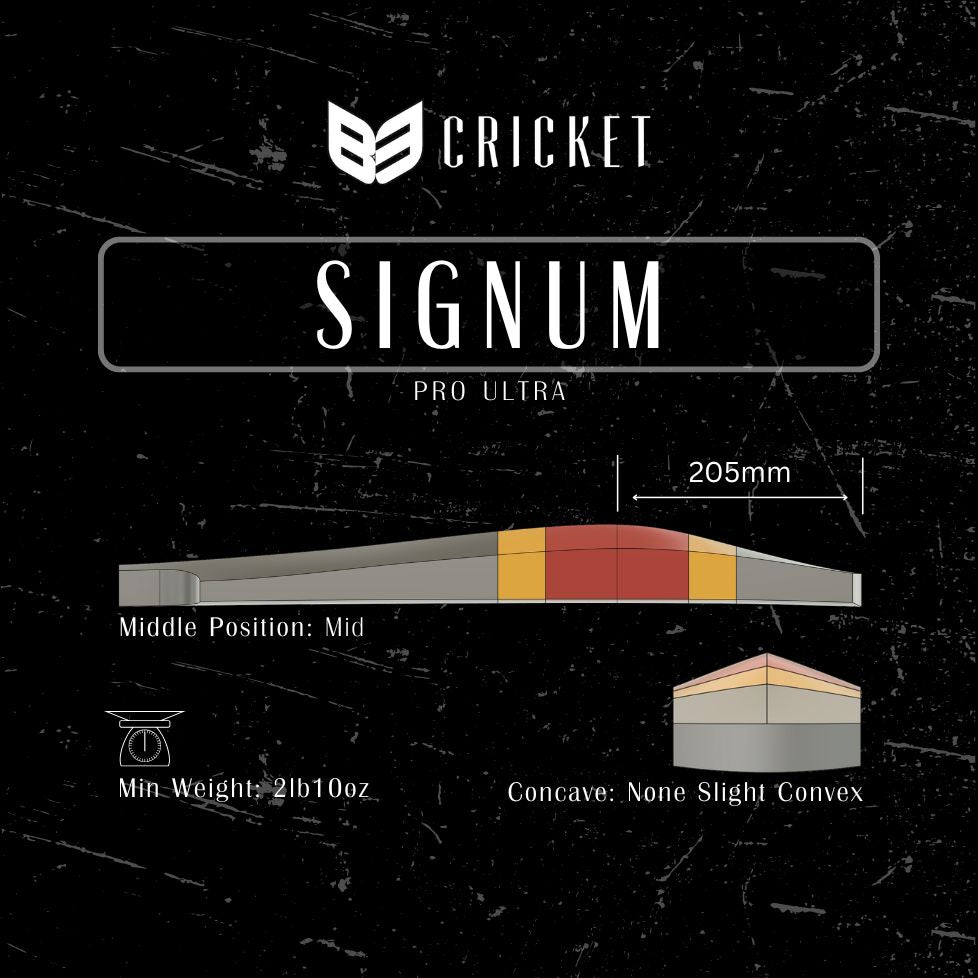 Inspired by request from several top pro players for a meaty, full profile bat. The Signum ticks all the boxes and is huge throughout with no concaving. Special emphasis has also gone into a strong shoulder and toe to help withstand the forces of the modern game.